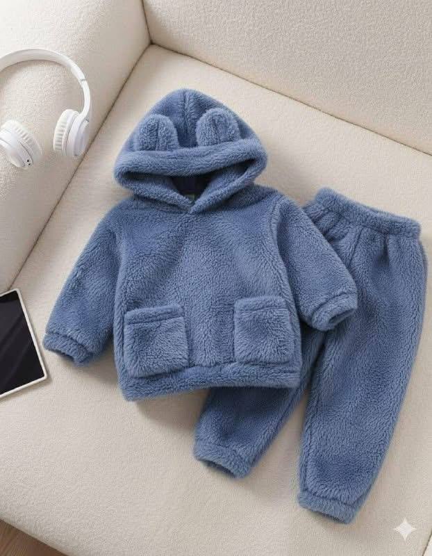 طقم أطفال شتوي من فرو ناعم، دافئ ومريح، يتكون من كنزة بقبعة وبنطال متناسق، مثالي للبرد والاستخدام اليومي